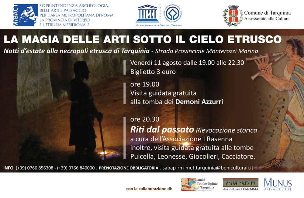 Il programma prevede alle ore 19.00 la visita guidata alla tomba dei Demoni Azzurri; alle ore 20.30 la rievocazione storica a cura dell’Associazione I Rasenna e visita guidata gratuita alle tombe Pulcella, Leonesse, Giocolieri, Cacciatore.